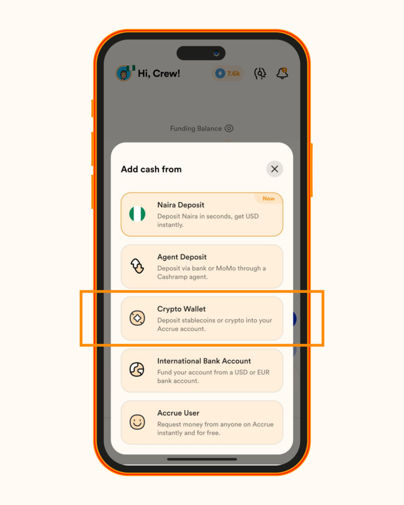 Accrue allows users in Ghana to receive USDC directly into their crypto wallet inside the app. The process is quick, but one detail matters more than anything else: choosing the correct network. If the wrong network is used, your funds may be lost.